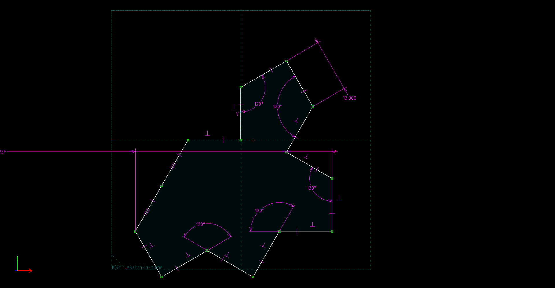 - Aperiodic Tile version 1 (SolveSpace / STL) — This is a printable aperiodic tile as explained in this Scientific American article. Unlike Spectre below, this aperiodic tile version requires that the tile's mirror image be used at times. In this SolveSpace design, three hexagons are constructed, then the perimeter of the tile is created using coordinates provided by the hexagons. Click here for an image of the key sketch. Notice that the majority of the lines are construction lines, meaning lines that provide dimensioning/geometry but don't become part of the exported sketch.
