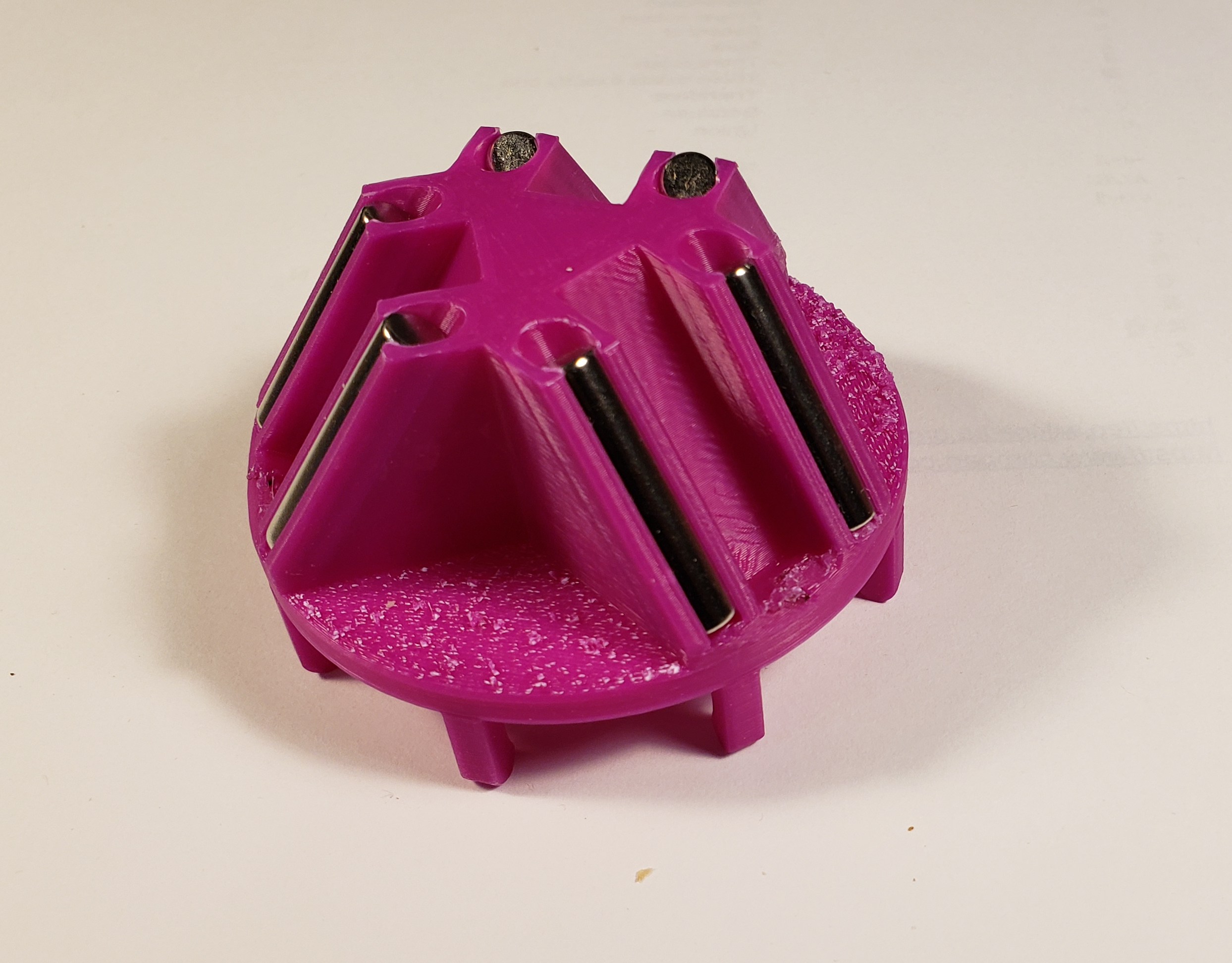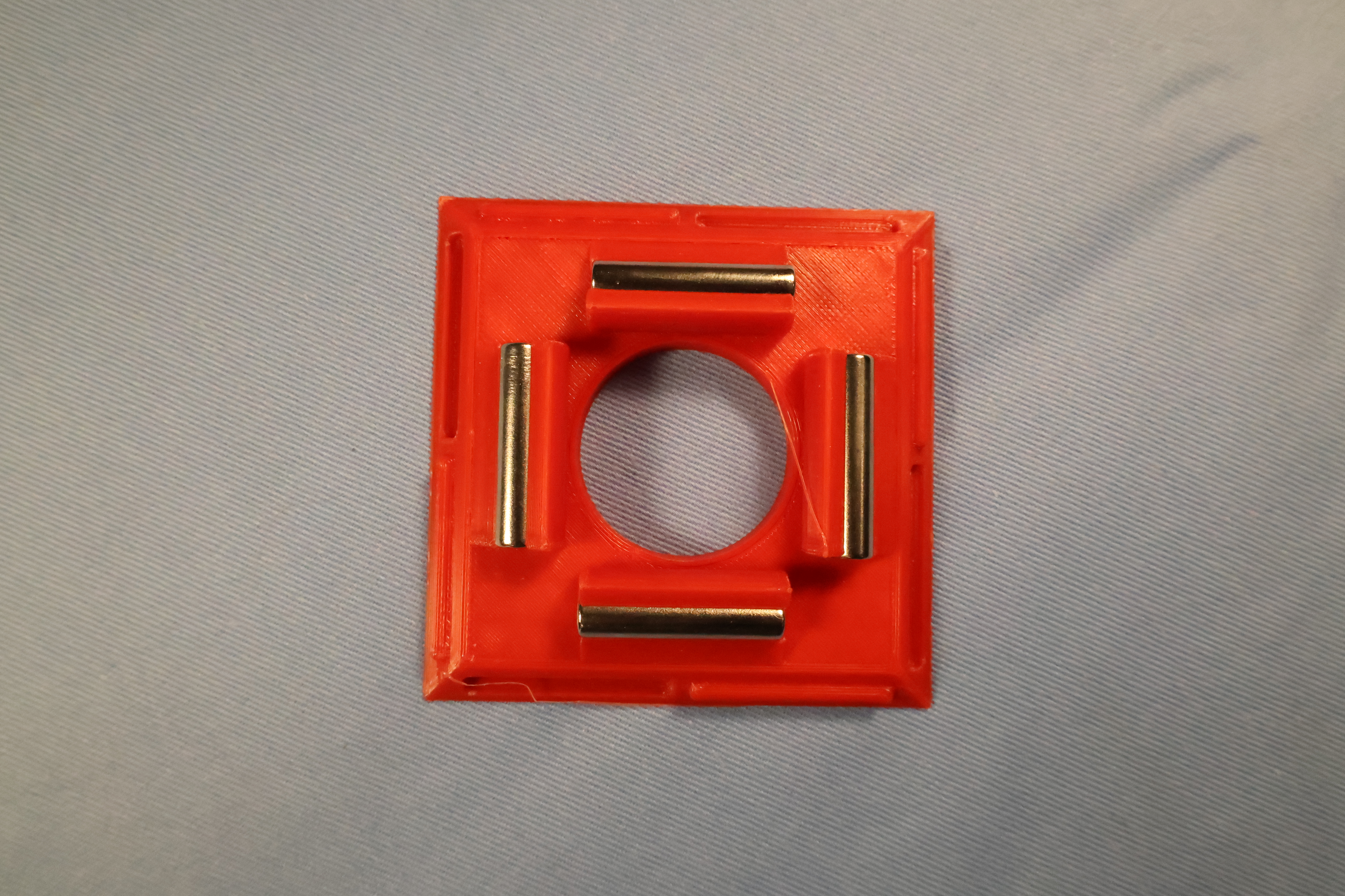 - Slide six neodymium magnets into the slots provided in the 3D printed mount. Make sure all the magnets are inserted with the same polarity, i.e. the magnets should have either their North or South poles all pointing toward the center of the mount.