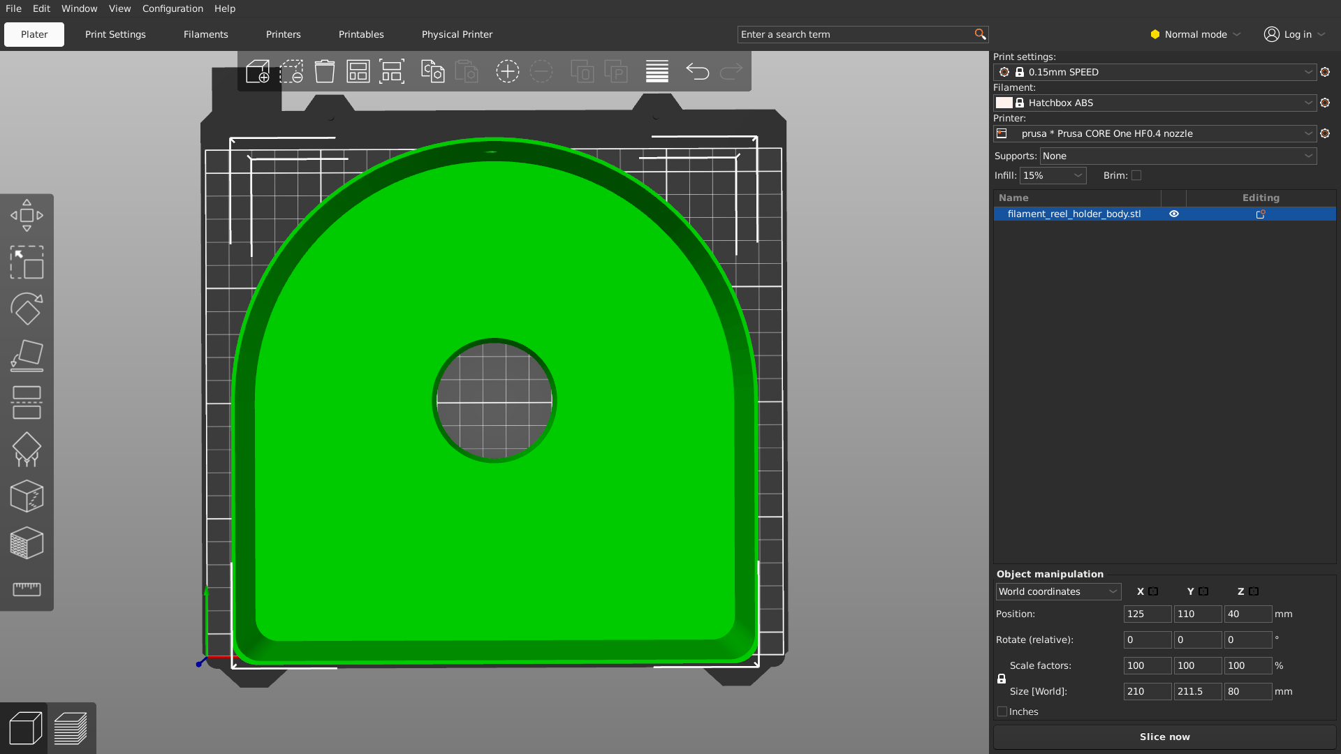 To change this project's dimensions, edit the source and change the clearly named variables. I include these control variables because not all filament reels have the same dimensions (the defaults are set for Hatchbox filament reels). But larger filament reels may exceed the printing size of the Prusa Core One. Even with the Hatchbox reel defaults, printing this project requires nearly every square millimeter of the printer's X and Y dimensions.