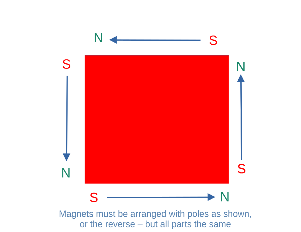 Add magnets to each part, remembering to keep the magnetic poles consistent — either North-pole counterclockwise, or the reverse, but consistently across all the parts: