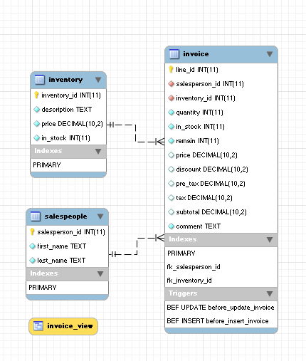 create or replace view invoice_view as select concat(se.first_name,' ',se.last_name) as Salesperson, inv.description as Item, iv.quantity as Quantity, iv.in_stock as `In Stock`, iv.remain as `Remain`, iv.price as Price, iv.discount as `Discount %`, iv.pre_tax as Pretax, iv.tax as Tax, iv.subtotal as Subtotal, iv.comment as Comment from invoice as iv left join inventory as inv on iv.inventory_id = inv.inventory_id left join salespeople as se on iv.salesperson_id = se.salesperson_id;The full details of the relational demonstration, as well as the opportunity to load and run the demonstration, can be gotten from the MySQL code file relational_demo.sql.