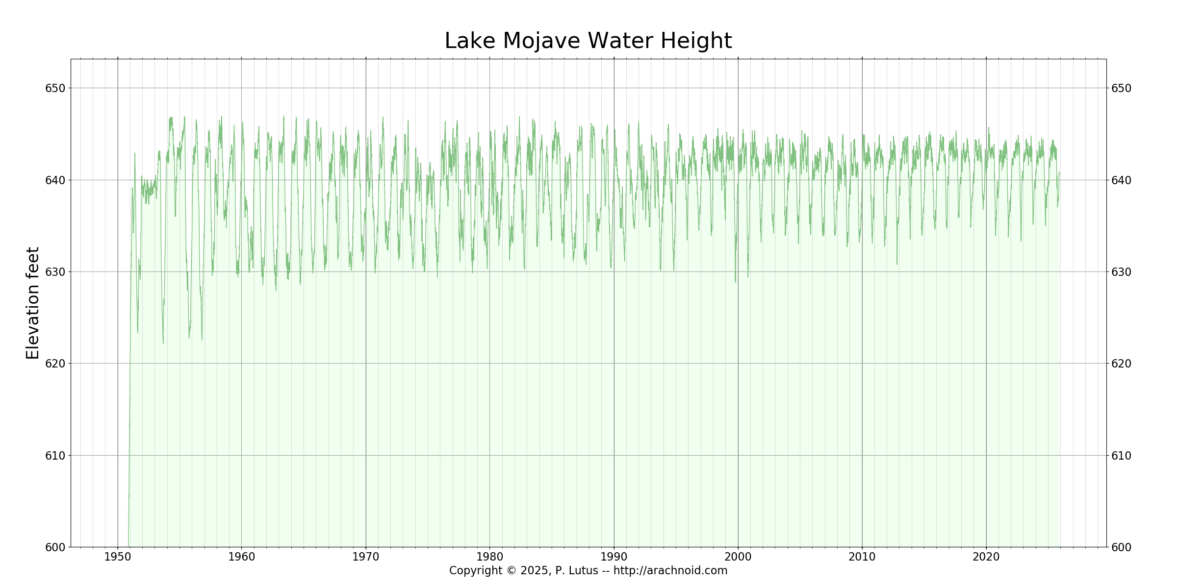 This chart is dynamically updated. This page reads data from a government archive of water heights for Lake Mohave from its first filling to the present, and draws the chart on that basis. The database, located at https://www.usbr.gov/uc/water/hydrodata/, is updated once per month. This page's graphic updates itself in step with the data source, over time giving an easy-to-interpret picture of Lake Mohave water levels. |
