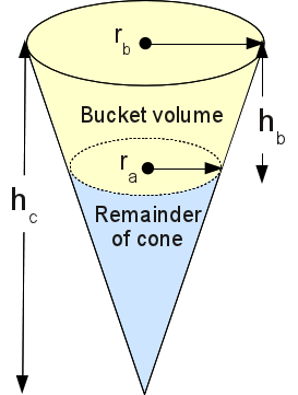 (1) $\displaystyle h_c = \frac{h_{b}\ r_b}{r_b-r_a}$With equation (1) we can write a preliminary equation for the bucket volume bv: