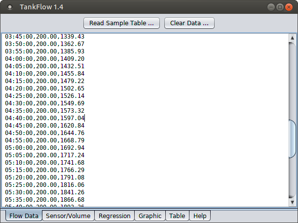 - TankFlow provides a built-in sample data table for tutorial and instructional purposes ("Flow Data" tab, "Read Sample Table ..."). This table can be used to become familiar with expected data formats and to practice creating regression results.