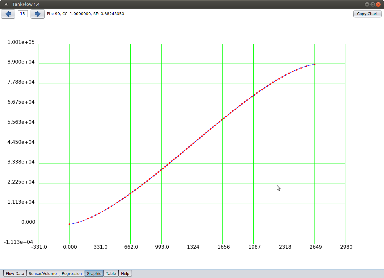 The probem with this intermediate result is that it's incremental — there are gaps between volumes listed in the result. What we need is a continuous mathematical function to provide any sensor height for any specified volume, including volumes not recorded, as well as the reverse case (volumes for sensor heights). To get this result, TankFlow uses a method called polynomial regression (on the "Regression" tab) to convert the stepwise volume/sensor height table into a continuous function able to provide any volume for any sensor height or the reverse. The generated function can be exported into other environments and programs, and can be used to create a table of results with user-selected step sizes.