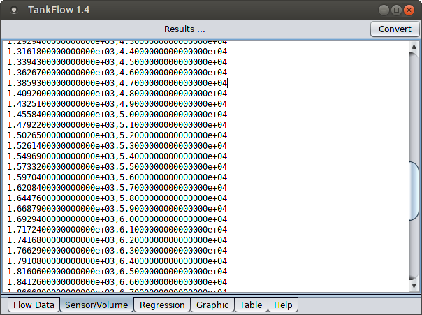 - TankFlow accepts field-recorded data as three-column records of times, flow rates and sensor heights, but it also accepts data of a more conventional kind — two-column records of tank volumes and corresponding sensor heights. To use TankFlow this way, paste the two-column data directly into the "Sensor/Volume" tab, then move to the "Regression" tab for analysis and function creation.