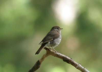 many years ago, I have been trying to get a picture of a hermit thrush, but without success until this year. The hermit thrush deserves its name, being rather shy and physically small as well. I was hiking on Shuyak Island north of Kodiak Island, when I realized I had wandered into a stand of trees occupied only by hermit thrushes — I had never heard so many simultaneous hermit thrush songs anywhere. Given this cacophony, I realized if I saw the shadow of a bird passing across the ground, chances would be very good that it was a hermit thrush. So I began carrying my camera around my neck at the ready. I saw a shadow, quickly turned and began snapping away, and got one useful exposure before the shy bird departed.