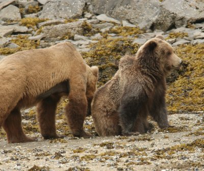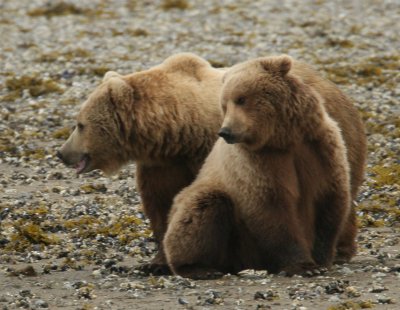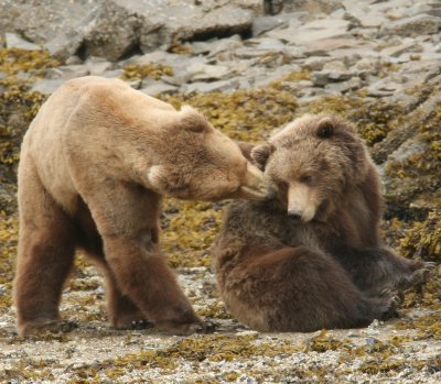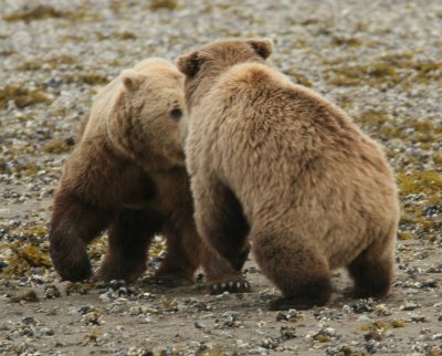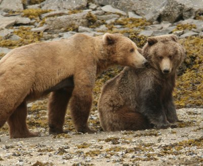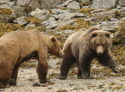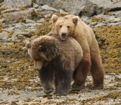 The pictures on this page are mostly of a mature mating couple (not to suggest that bears choose the same partner year after year), bears not inclined to fight with each other or with competing bears, and I chose this image set for exactly that reason — e.g. one issue at a time. But these images are not typical — it is much more likely that several male bears will fight until one of them has exhausted the others and driven them away from the females, at which point that so-called "alpha male" will have the pick of the females, if only for a while.
