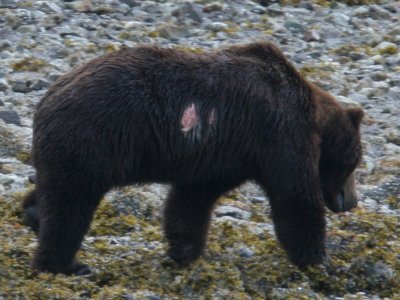 This is Othello, a relatively young, inexperienced bear, who wants to be the alpha male but may not have the strength or experience to carry it off. Note the scar, the result of a serious fight earlier in the day with George, his primary adversary. Note also that Othello is a brown bear (species) with black fur (color). One can't distinguish bear species by their fur color. There are black brown bears, and brown black bears, if you follow me.