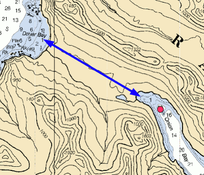 When I first visited Onion Bay years ago, I tried hiking to the northeast of the anchorage (see Figure 1), but the terrain there is very brushy and I kept encountering bears while moving through shoulder-high brush, a risky activity. Since then I've been developing a trail to the Southwest of the best anchorage that leads to a peak with a nice view (Figure 1, the peak marked "1603"). While visiting this peak, I've noticed a likely route for a hike across reasonably level terrain from Onion Bay to Shelikof Strait to the Northwest.