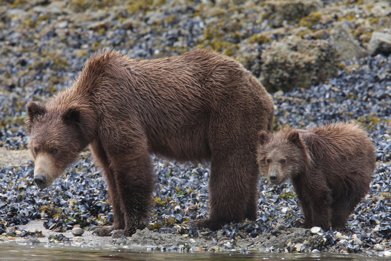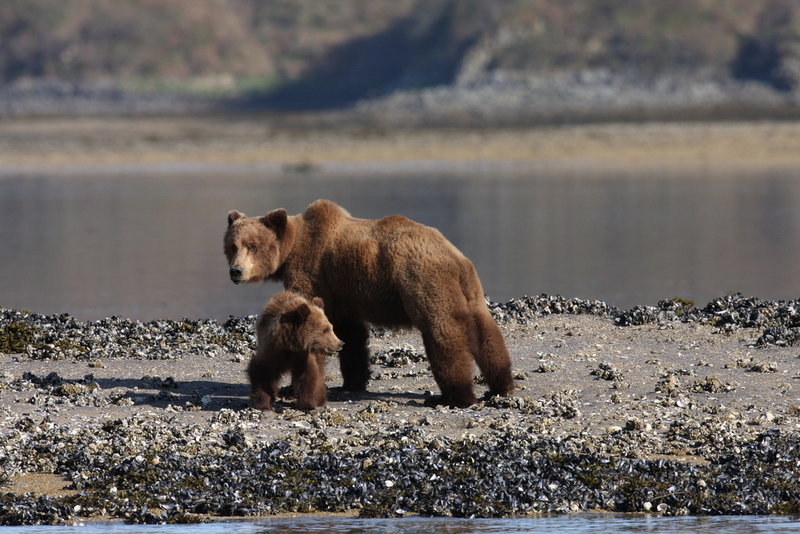A cautious mama bear and cub at Geographic Harbor