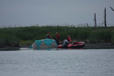 These are reasonable questions, but in the context of an Alaska wilderness site, I acted appropriately. First, if I went ashore to move the tent and if the kayakers were asleep inside (something I didn't know), they would have the right to shoot me on the spot. Later, they could say, "I thought it was a bear outside my tent, instead it was an idiot — I shot him, so sue me." As to the kayaks, an observer might well draw the conclusion that I was trying to steal two rather nice boats, and my explanation might ring hollow — "I was keeping them from drifting away." Sure, buddy.
