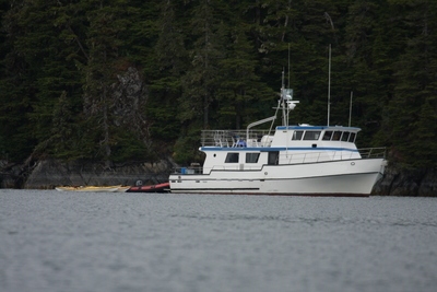 But I finally figured it out — they hadn't paddled to Coghill Point from the nearest town (Wrangell, 31 nautical miles away), they had been transported by a wilderness cruise outfit with a big boat (see picture below) who put them into the kayaks just offshore — they had paddled just 1/2 mile to the beach. They didn't really need to know anything — their rescuers were within shouting distance.