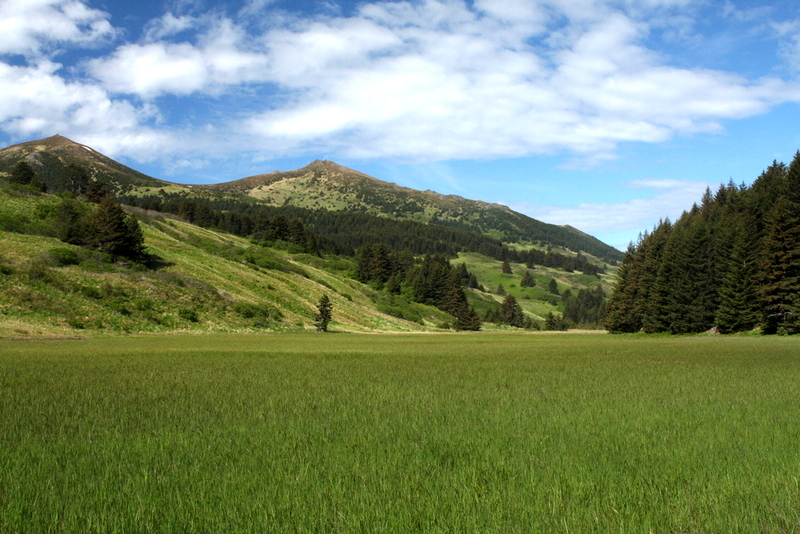 When I visit Onion Bay on Raspberry Island, I make time for a nice hike through a pretty valley that runs from Onion Bay on one side to Shelikof Strait on the other. Here is a picture of the valley, as seen from a nearby mountain: