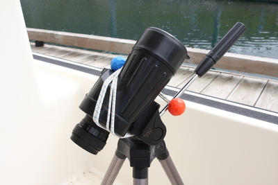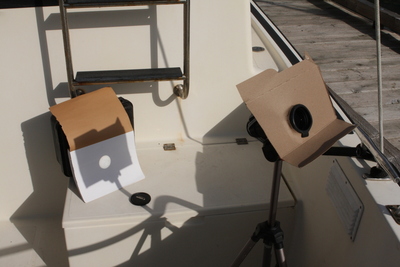 I decided to see if I had some optics on my boat that could be used for a solar projector. I tested my many camera lenses, but none of them produced an image that was large enough. Finally I realized my boat binoculars (10x50) were essentially perfect for the job. I decided to temporarily split my binoculars in two because (a) I only needed one solar image, and (b) I was going to take the apparatus into town on my bike and I wanted to lighten my load. Here are some images of the Venus transit activity:
