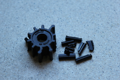 Figure 4: The generator pump impellerWhen I first acquired my present boat, I didn't fully appreciate the problems impeller pumps cause. One morning I departed an anchorage with the house-power generator still running to charge my batteries. At that time the generator's raw water intake port didn't have a screen, it was just a bare opening, vulnerable to blockage. I passed over some seaweed, the intake port sucked it up, this blocked the water intake, the pump went dry, the impeller disintegrated, the cooling system failed, and the generator overheated and shut down — all in three minutes.