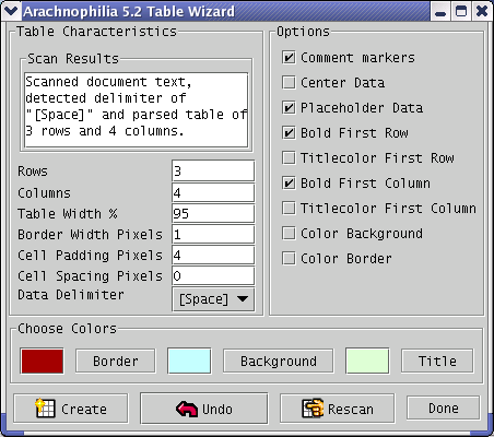 This page describes the Table Wizard and a new, more flexible way to deal with lists than existed in the previous version of Arachnophilia.
