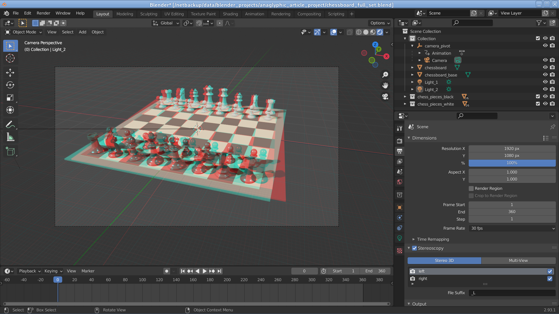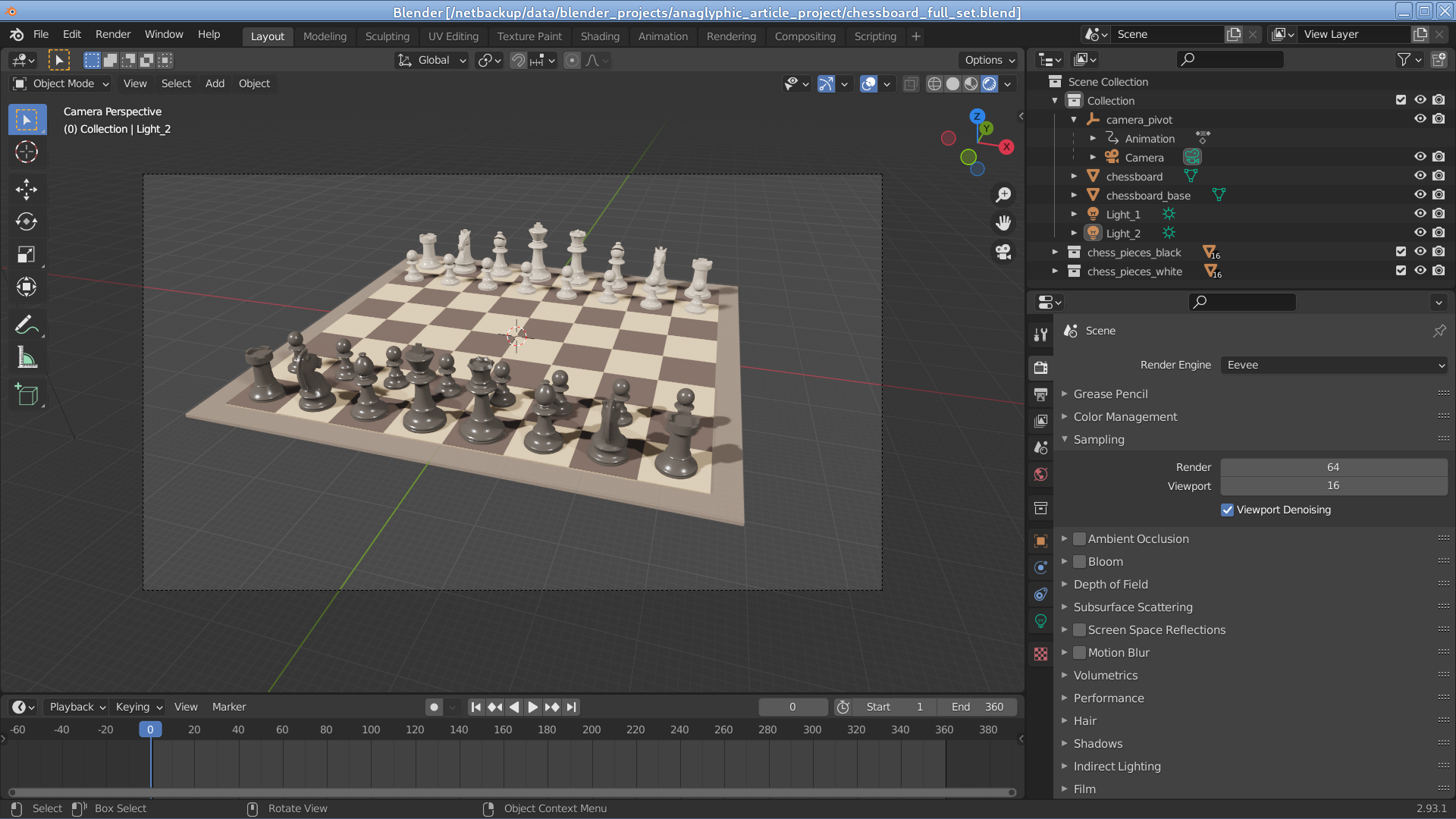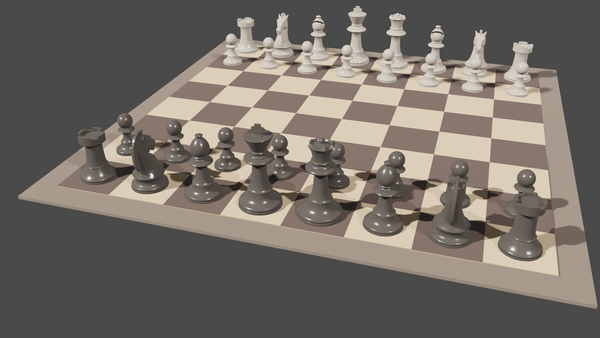 • Click here to download an example Blender project that shows a chessboard and animates it in 3D. Here is how it should appear initially (click image for full-size):