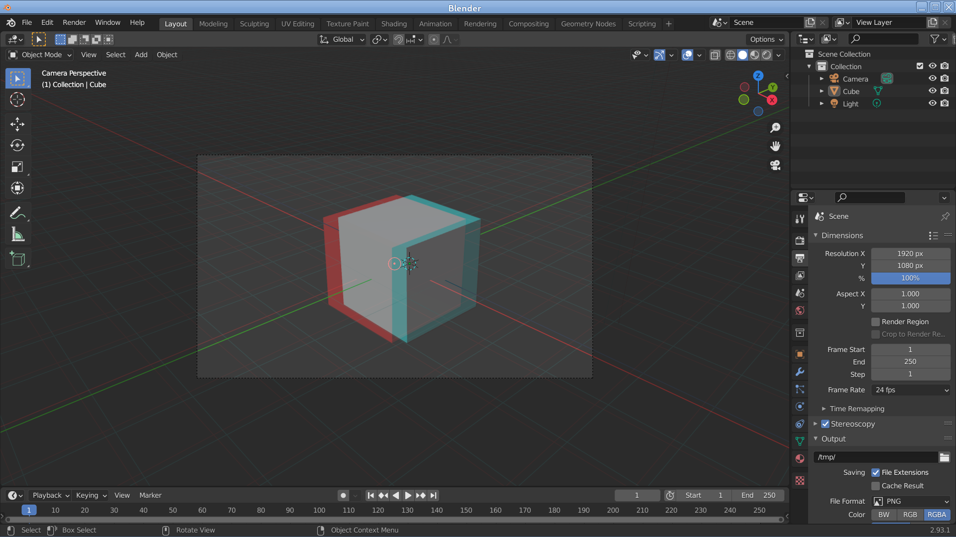 • If you now don your red/cyan glasses, the default Blender cube should appear in 3D.