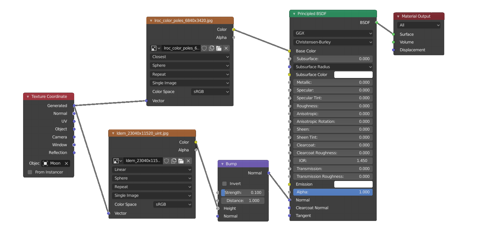 • The two Image Textures are synchronized with the sphere's polar coordinates by a Texture Coordinate node (red top bar at the left).