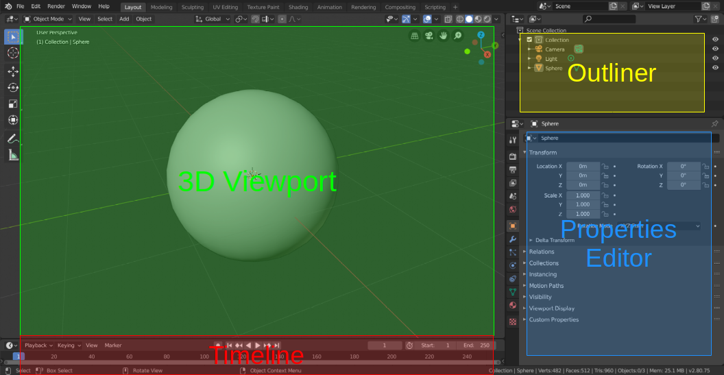 In this section we'll tackle the easiest parts. But first, let's take a look at Blender's user interface (Blender 2.80):