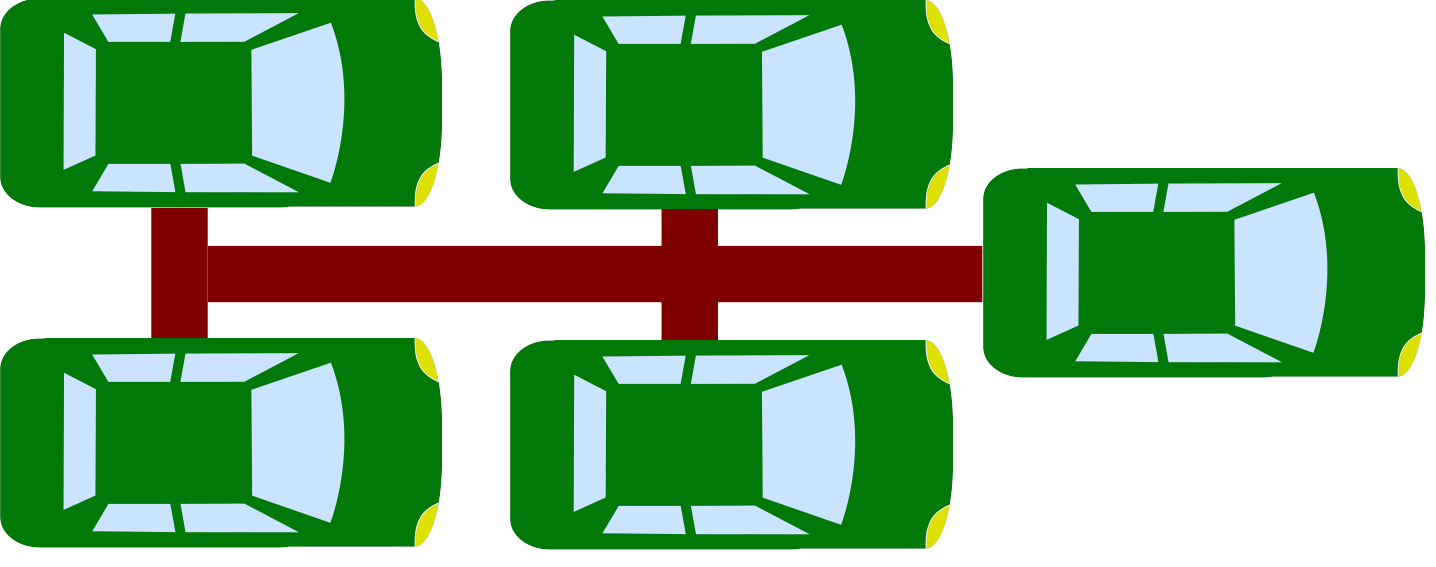 Now — read carefully — imagine that the five vehicles are connected together with rigid steel bars, so they move as a unit. Test their stopping distance. It will be the same as when the vehicles were not connected together, but by connecting them, you have assembled a vehicle that weighs 35 tons (70,000 pounds), has 20 tires, but that stops in the same time and distance as when they were separated.