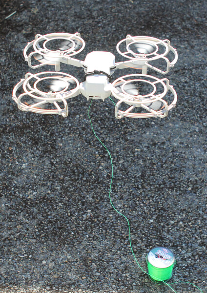 On that basis I chose a very light monofilament fishing line with a breaking strength of 25 pounds (roughly 11 kilos) but that weighs very little, so the drone could raise the line to a substantial height while behaving more or less normally.