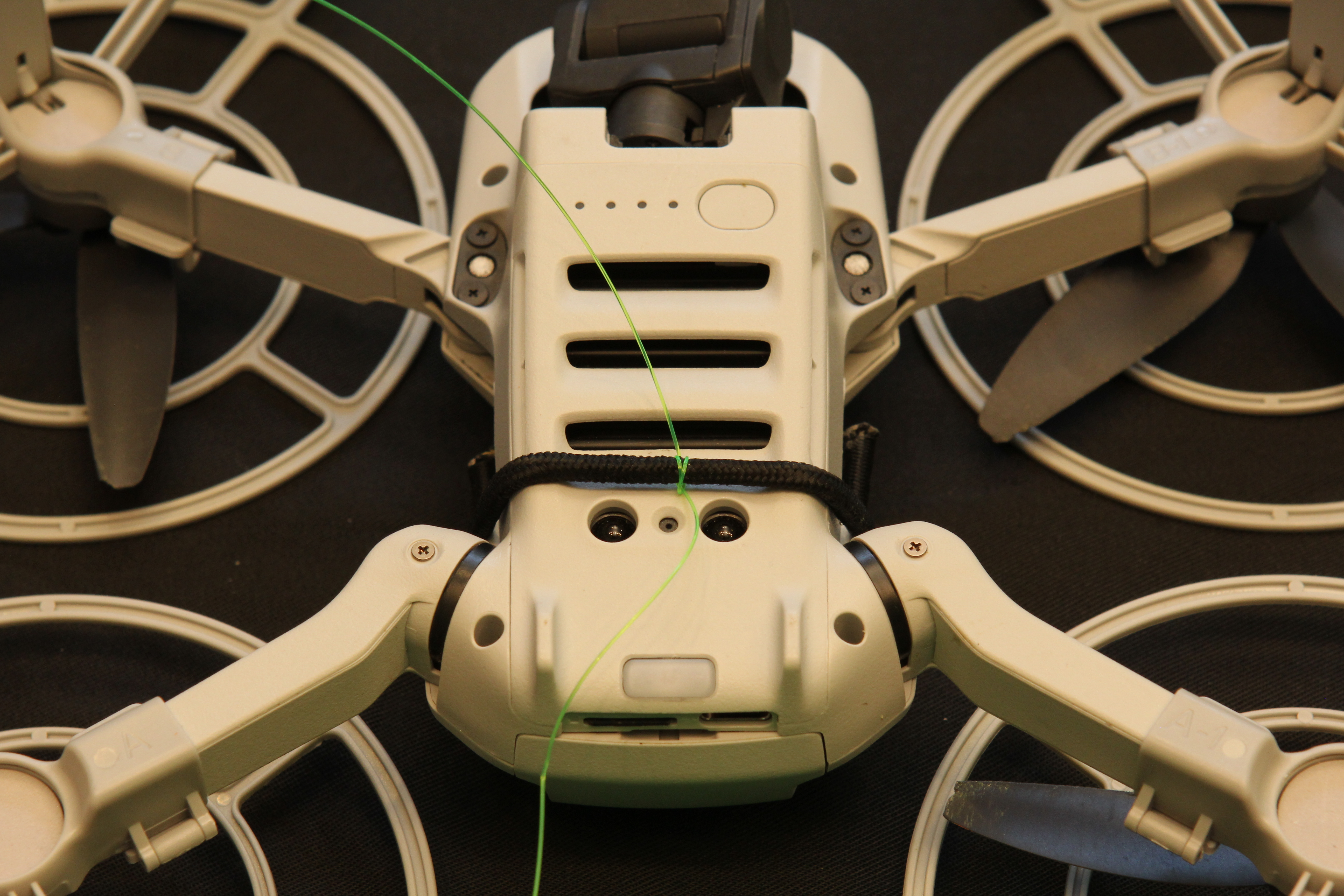 To anchor the fishing line, the drone should be equipped with an elastic shock cord — a short length of flexible cord tied to the drone as shown: