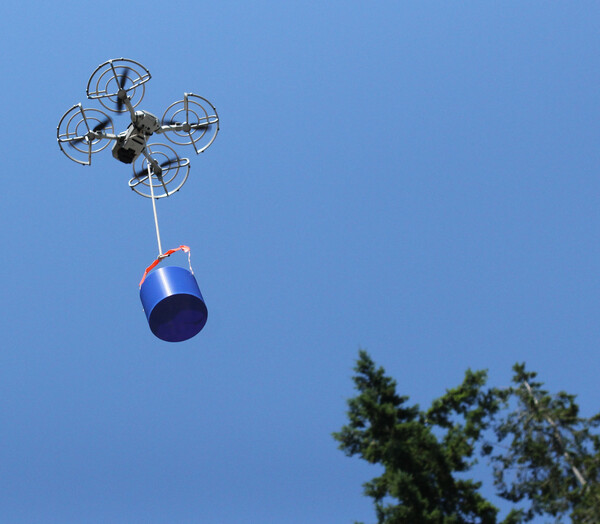 Figure 2: Testing my drone's load limitTo choose the first, lightest line, I needed to know how much weight my DJI Mini 2 drone could lift. I rigged a test container and added small weights until the drone refused to leave the ground. After some tuning I decided the drone could lift about 8 imperial ounces (roughly 227 grams), but not for a very long flight time and not without complaining and behaving erratically.