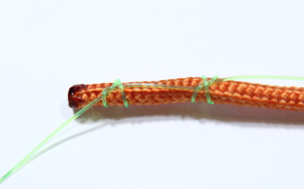 Notice about this splice that care has been taken to avoid a dangling line end that could snag on obstacles as the parachute cord replaces the fishing line along the route.