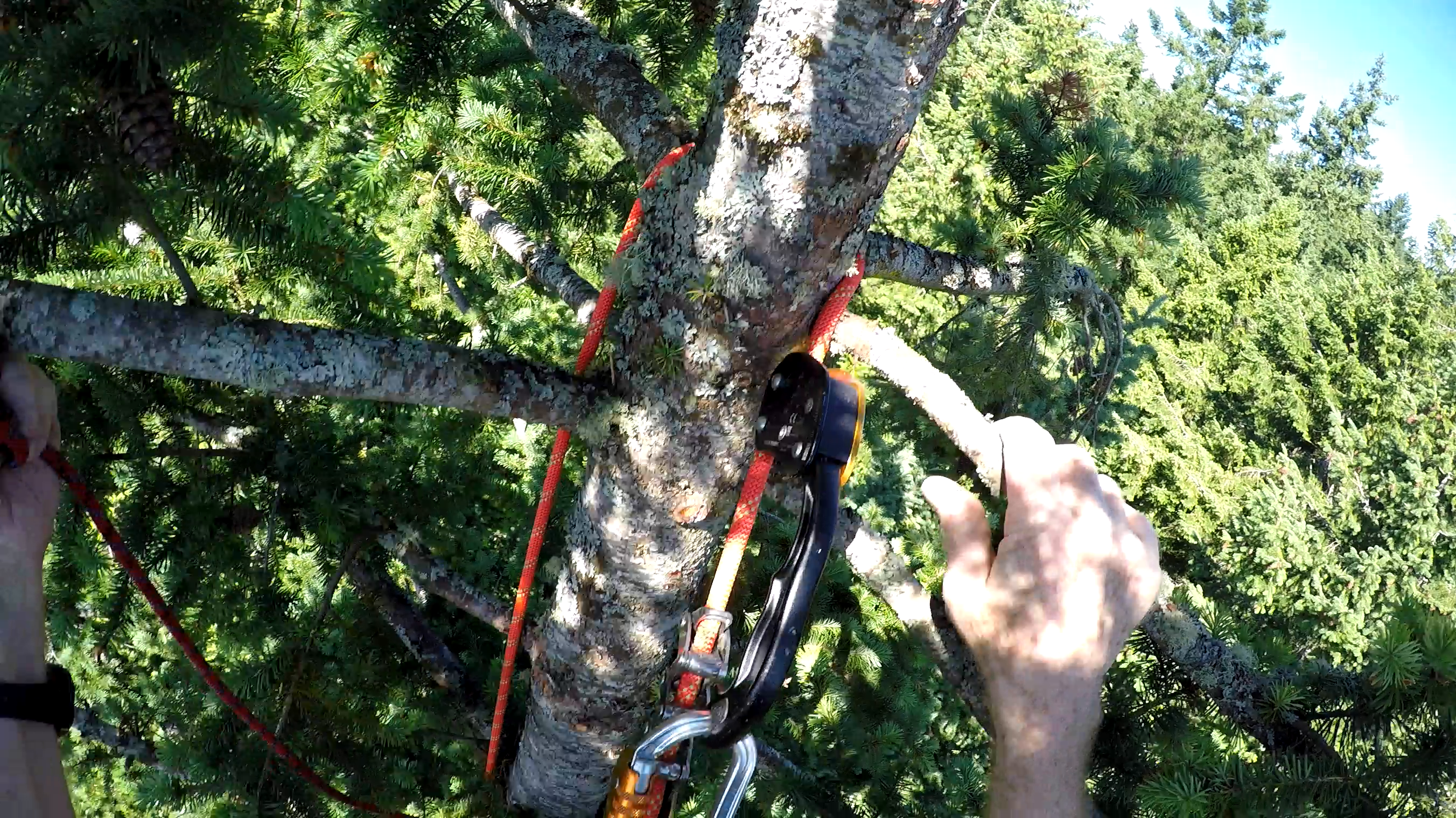 These changes allowed the climbing line to pass around the tree trunk, in spite of the high loads on both sides of the high-friction area (a 130 foot length of typical 11mm climbing line weighs seven pounds or about 3 kilos).