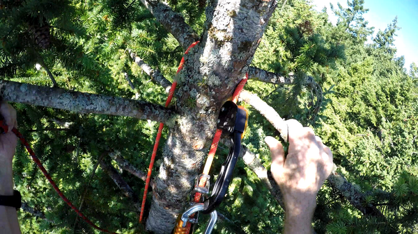 After some preliminary drone surveys of the area near the top of the tree, I decided the trunk was thick enough at 130 feet (about 40 meters) to bear my weight, but for adequate anchor strength I realized I would need to wrap the climbing line around the tree's trunk, not just drape it over a limb as is normally done — at 130 feet, individual limb sizes looked too small to inspire confidence.