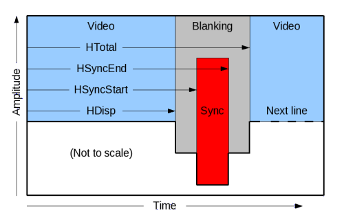 - A sync pulse within the blanking interval with a span equal to HSyncEnd - HSyncStart (red color).
