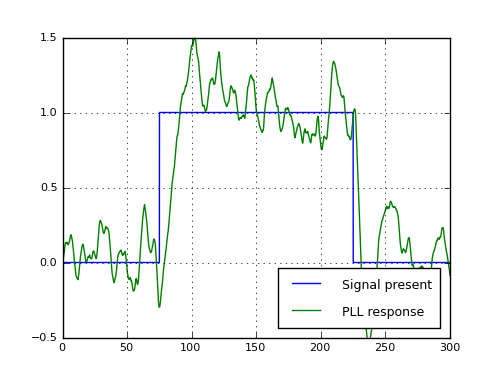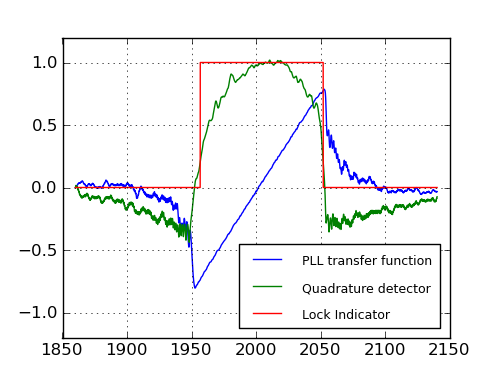 pll_loop_control = test_sig * ref_sig * pll_loop_gain # phase detector pll_loop_control = loop_lowpass(pll_loop_control) # loop low-pass filter output = output_lowpass(pll_loop_control) # output low-pass filter pll_integral += pll_loop_control / sample_rate # FM integral ref_sig = cos(2 * pi * pll_cf * (t + pll_integral)) # reference signal quad_ref = (ref_sig-old_ref) * sample_rate / (2 * pi * pll_cf) # quadrature reference old_ref = ref_sig pll_lock = lock_lowpass(-quad_ref * test_sig) # lock sensor logic_lock = (0,1)[pll_lock > 0.1] # logical lockIn this excerpt, the "output" variable produces the blue trace in Figure 6, "pll_lock" produces the green trace, and "logic_lock" produces the red trace.