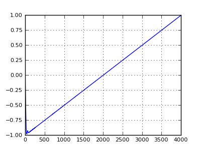 This example is meant to show that a PLL can be configured to have very wide lock bandwidth, if the communications channel has little noise and the signal has consistent amplitude. Figure 7 shows the transfer function for this example. The test signal (frequency on the horizontal axis) is swept from 0 Hz to 4,000 Hz, and the PLL remains locked to the input signal in the range 100 — 4000 Hz.
