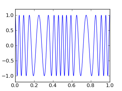 #!/usr/bin/env python # -*- coding: utf-8 -*- from pylab import * sample_rate = 1000.0 cf = 16 # carrier frequency mf = 2 # modulation frequency mod_index = .5 # modulation index fm_int = 0 # FM integral dt = [] dfm = [] for n in range(int(sample_rate)): t = n / sample_rate # time seconds mod = cos(2 * pi * mf * t) # modulation fm_int += mod * mod_index / sample_rate # modulation integral fm = cos(2 * pi * cf * (t + fm_int)) # generate FM signal dt.append(t) dfm.append(fm) plot(dt,dfm) ylim(-1.2,1.2) gcf().set_size_inches(4,3) savefig('simple_fm_generator.png') show()In just a few lines, this listing produces what would be the most difficult part of a conventional (non-software) PLL design — a well-defined, controllable reference oscillator with few practical limitations. It also shows the advantage of the software design approach over the analog and integrated-circuit approaches — using the older methods, achieving the above result would lie somewhere between difficult and impossible.