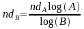 To determine the number of digits in base B (ndB) for a given number of digits in base A (ndA), use this equation:![]()
