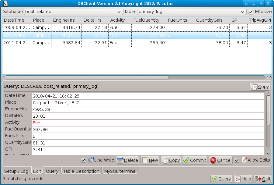 The other primary database activity is entering and editing records, and DBclient does this very well. Here's a picture of DBClient in its editor mode: