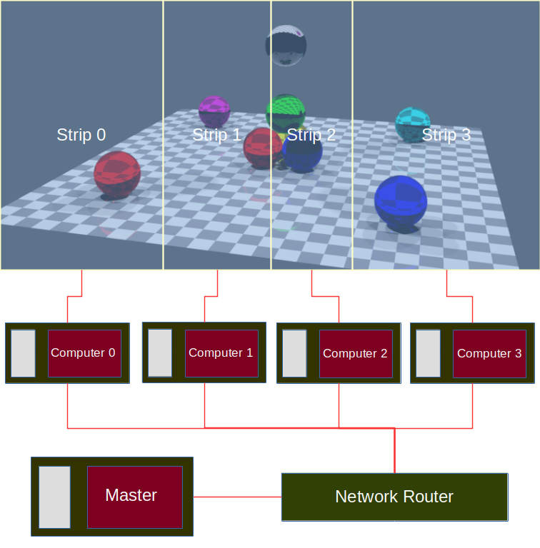 • When all the machines have completed their parts of the render, my program collects all the strips and knits them together into a final image. This method's required image format (click here to see the Blender entry) — transparent PNG with either 8 or 16-bit color depth (with color specifier RGBA) — makes possible seamless image assembly.