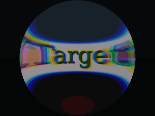 Eyepiece view (20°)I wasn't very careful to make the target image in the target and eyepiece views equal in size (wanting to show the full field in the eyepiece view), also the field distortion makes comparison rather difficult, but it appears this telescope has a magnifying power of about 10x. The eyepiece view has the curvature and distortion it does because of the relatively short focal length of our objective lens. The color fringing represents a simulation of the amount of chromatic aberration this kind of lens would have, when no effort is made to correct it.