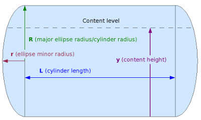 Figure 2: Cylindrical tank variable namesThis page describes methods for computing partial volumes in storage tanks such as are shown in Figures 1 and 2. This very common storage tank class includes simple cylinders with flat ends, cylinders with hemispherical ends, and many intermediate types with elliptical end caps (Figure 2). The methods on this page are suitable for computing partial volumes of all such tanks, with the single requirement that the tank be level.