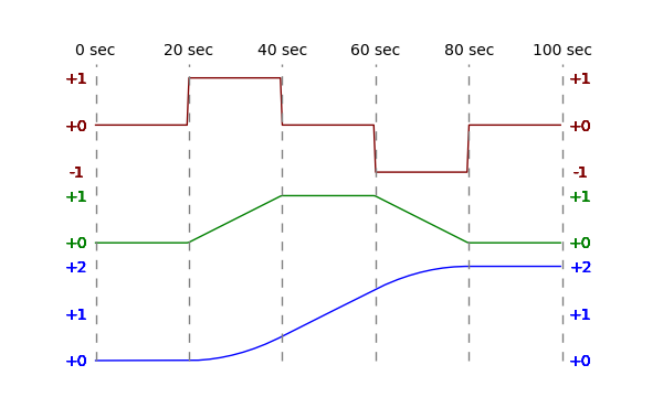 The car's final position differs from its starting position by 2 units. This value represents the time integral of all applied velocities, from time zero to the present. By the same token, the car's final velocity represents the time integral of all applied accelerations, from time zero to the present. This means the three quantities (acceleration, velocity and position) are interdependent. Let's explore that idea.