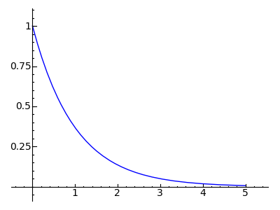 This expression says that the unknown function (the function to be found) produces the sum of y(t) and r c y'(t) for any time t, and that the initial value of the function at time zero is 1. (The meaning of r and c will become clear after a bit.) This is an example of a differential equation that specifies an initial value, as many do. In this case I intend to scale the result after acquiring the result, and this initial value makes that easy. Here is how I submit this differential equation to Sage: