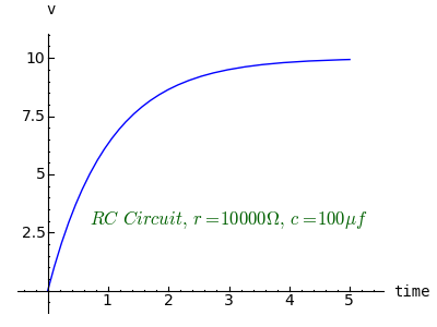 lbl = text("$RC \, Circuit, \, r = 10000\Omega, \, c = 100\mu f $",(3,3),fontsize=12,rgbcolor='#006000')
