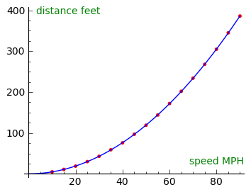 Here is a convenient equation to predict total stopping distance in feet (including a 1.5-second reaction time), using an argument of velocity in miles per hour: